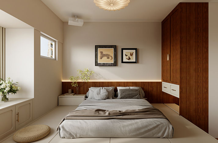 睡房|🛏️榻榻米設計將床櫃融為一體,規整收納的秩序;投影儀設計與時俱進🎥,豐富和睦溫馨的睡前小憩💤